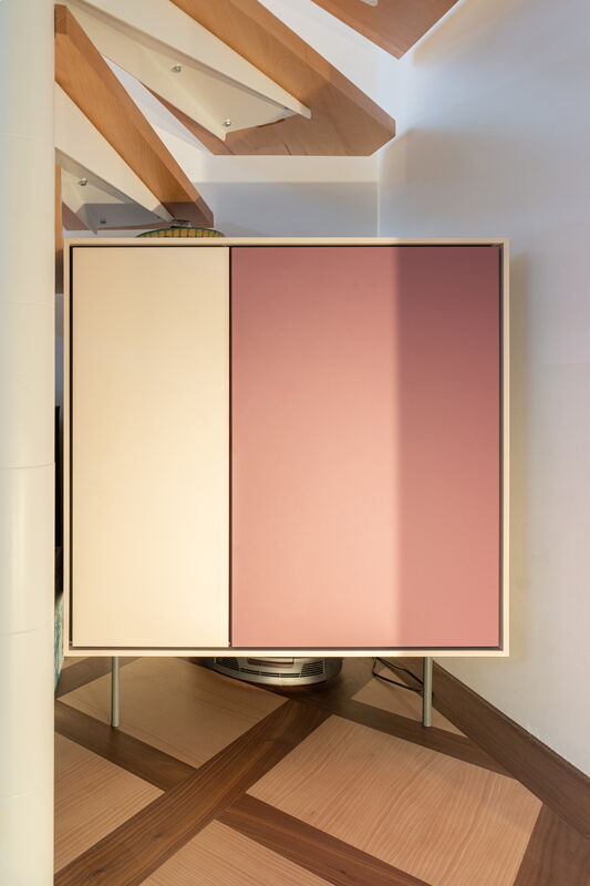 Moderne Kombination aus weiss lackierter Ablagefläche und hölzernem Kommodenmöbel.