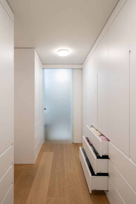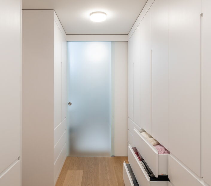 Grosszügiges Ablagesystem aus weiss lackierten Schränken und Schubladenmöbeln, das keine Wünsche offen lässt.